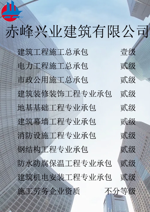 赤峰興業(yè)建筑有限公司簡介 赤峰興業(yè)建筑有限公司成立于1998年7月,位于內蒙古赤峰市松山區(qū)。現已發(fā)展成為擁有建筑工程施工總承包壹級、電力工程施工總承包貳級、市政公用工程施工總承包貳級、承裝、修、試四級、?建筑裝修裝飾工程專業(yè)承包貳級、建筑幕墻工程專業(yè)承包貳級、消防設施工程專業(yè)承包貳級、地基基礎工程專業(yè)承包貳級、鋼結構工程專業(yè)承包貳級、建筑機電工程專業(yè)承包二級、防水防腐保溫工程專業(yè)承包貳級以及建筑施工勞務等資質的綜合性建筑施工企...